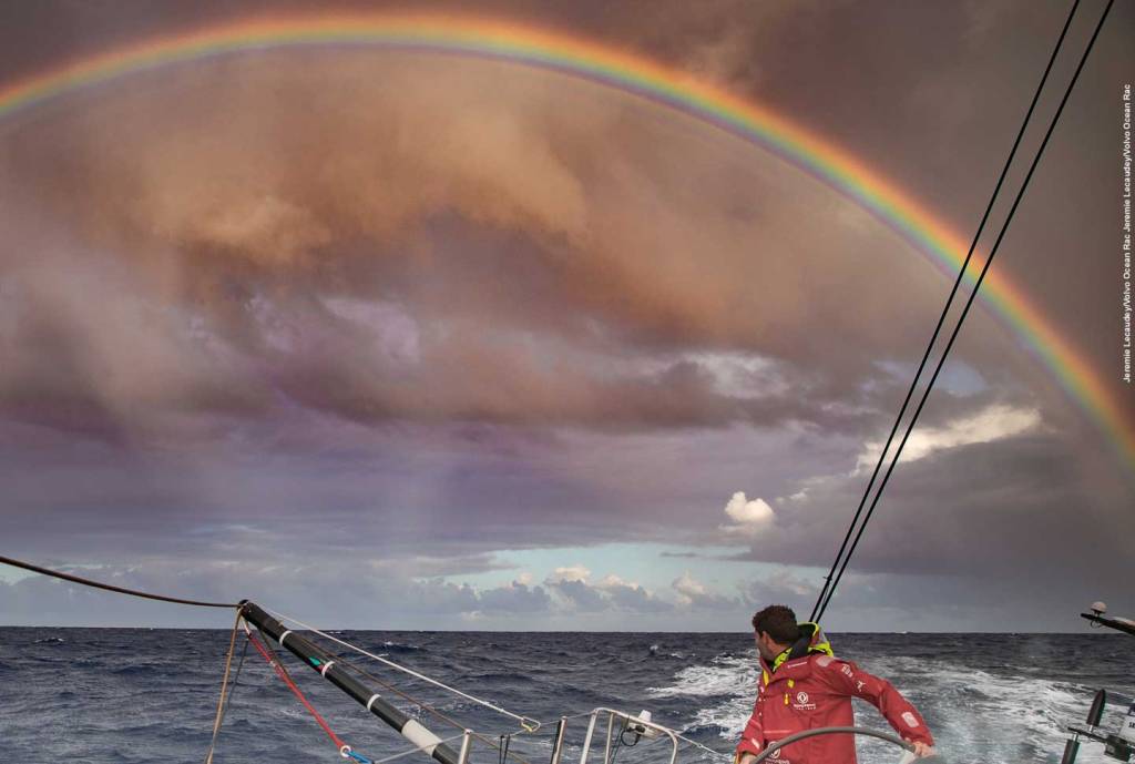 Le temps passe, les écrans restent muets. L’homme écoute le ciel et l’océan, il cherche en lui les échos d’un instinct oublié. D’un temps où l’humain savait naviguer, pêcher, subsister par lui-même. Jour après jour, notre skipper réussit à s’organiser malgré la panne générale. Il garde le cap, la mer n’a jamais été aussi belle. Il observe le ciel, la forme des nuages, la course du soleil, la place des constellations, il observe la houle, les oiseaux, les poissons. Une ligne de traîne lui offre parfois une dorade coryphène ou un thon, il boit l’eau de pluie. Le temps s’écoule différemment. Le bateau trace sa route entre les grains et les arcs-en-ciel.