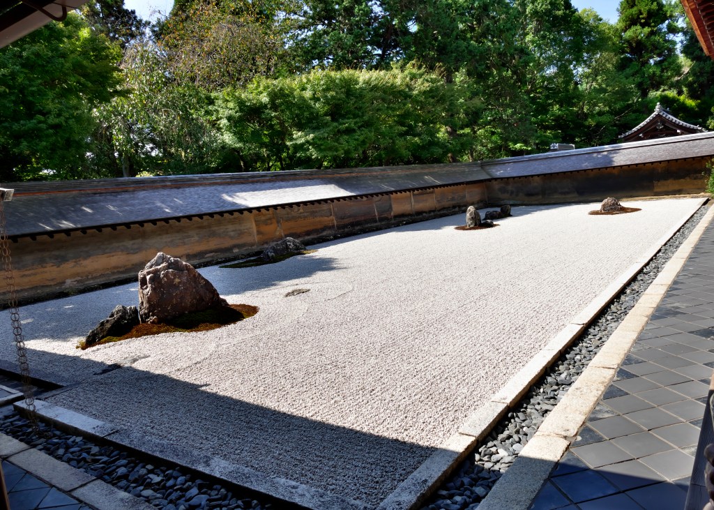 Nous poursuivons par la visite du temple Ryōan-ji, temple « du repos du dragon » et de son jardin de rocaille considéré comme un chef d’œuvre de la culture zen japonaise. C’est l’un des temples les plus visités du Japon, il est constitué de 15 pierres qu’il est impossible de voir toutes en même temps. L’intention du concepteur est encore inconnue mais une certitude, le jardin invite à la réflexion …