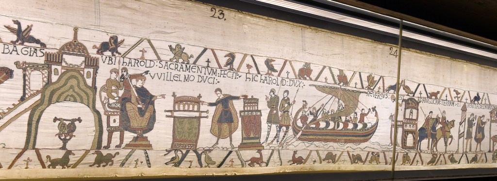 Le transfert de la tapisserie de Bayeux à Londres pour exposition, outre le fait qu’il provoque quelques polémiques relatives aux risques encourus par ce chef-d’œuvre lors de son déplacement, m’a poussée à m’intéresser davantage à cette création monumentale, et de façon plus générale à ce besoin des hommes d’imprimer une page de leur histoire.